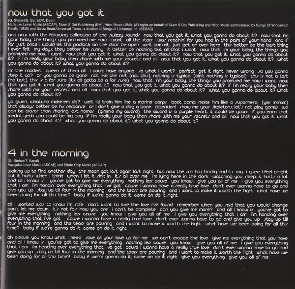 Engineer [Assistant] Hart Gunther | Mixed By Rich Travali | Producer The Neptunes | Recorded By Brian Garten | Written-By Gwen Stefani, Pharrell Williams