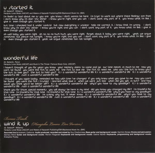 Engineer [Assistant] Alex Dromgoole, David Emery, Ian Rossiter, Kevin Mills | Guitar Martin L. Gore, Richard Hawley | Mixed By, Producer [Additional Production By] Mark Stent | Producer Nellee Hooper | Programmed By Ewan Pearson | Programmed By [Additional Mix Programming], Keyboards [Additional] Pete Davis | Recorded By Greg Collins, Simon Gogerly | Written-By Gwen Stefani, Linda Perry