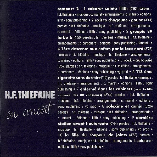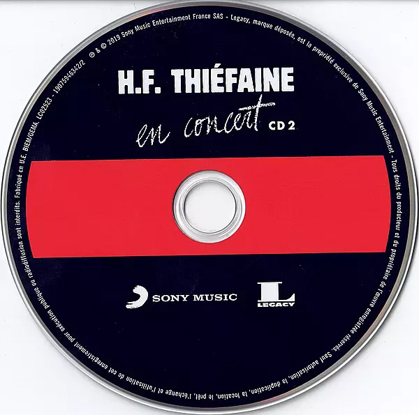 Hubert Félix Thiéfaine: En Concert verze na 2CD v standardní edici. Toto konkrétní vydání vyšlo v Francii ve vydavatelství Legacy ve spolupráci s Sony Music dne 5. července 2019. Album zasahuje do žánrů Rock, Pop, Pop Rock a Chanson.