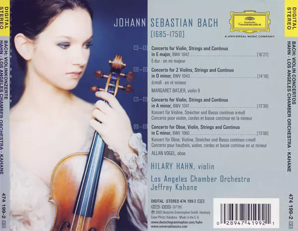 Pro svůj debut u Deutsche Grammophon si vybrala mladá houslistka Hilary Hahn velmi atraktivní a náročný repertoár - Bachovy koncerty, v nichž přirozeně housle hrají prim. Takže kromě dvou sólových koncertů je zde ještě Koncert pro dvoje housle a Koncert pro housle a hoboj. Hilary Hahn je i při svém věku již houslovou hvězdou první velikosti, o čemž se mohlo přesvědčit i publikum letošního festivalu Pražské jaro. Udivuje fantastickou technikou, nádherným tónem a přirozeným temperamentem. Přitom dokáže velmi citlivě uvažovat o stylu a charakteru každé skladby. Navíc hraje na jedny z nejlepších houslí legendárního Antonia Stradivariho. Není divu, že ji označil Time Magazine za „Nejlepšího mladého amerického hudebníka”.