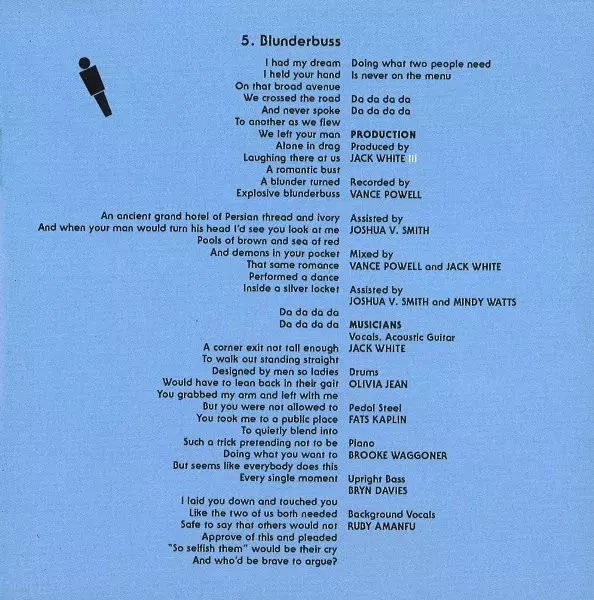 Acoustic Guitar Olivia Jean | Backing Vocals Karen Elson, Laura Matula, Ruby Amanfu | Double Bass [Upright Bass] Bryn Davies | Drums Patrick Keeler | Mixed By Jack White (2), Vance Powell | Pedal Steel Guitar Fats Kaplin | Piano Brooke Waggoner | Producer Jack White (2) | Recorded By Vance Powell | Recorded By [Assisted By], Mixed By [Assisted By] Joshua V. Smith | Vocals, Acoustic Guitar, Piano [Through A Leslie Speaker] Jack White (2)