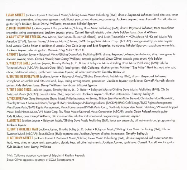 Alto Saxophone [Lead], Tenor Saxophone [Ensemble], Arranged By [String], Percussion [Additional], Drum Programming Jackiem Joyner | Bass Darryl Williams (12) | Drums Raymond Johnson (8) | Electric Guitar Kyle Bolden | Keyboards Carnell Harrell (2) | Trombone Nikolai Egorov | Written-By Jackiem Joyner