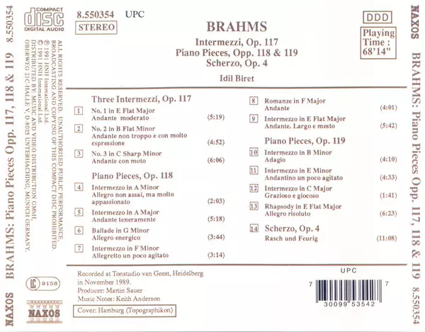 | Titul | Intermezzi, Op. 117 / Piano Pieces, Opp. 118 & 119, Scherzo, Op.4 |