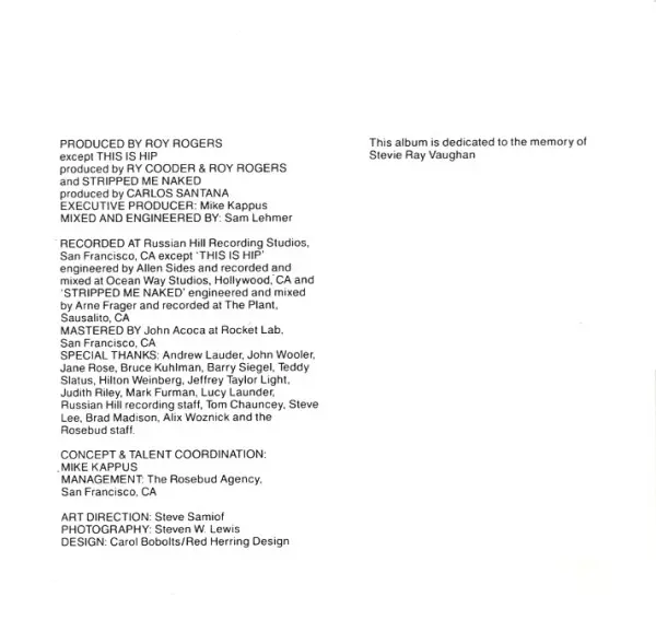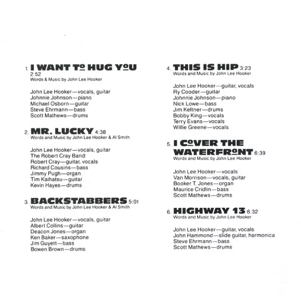 | Bass Nick Lowe | Drums Jim Keltner | Guitar Ry Cooder | Guitar, Vocals John Lee Hooker | Piano Johnnie Johnson | Vocals Bobby King, Terry Evans, Willie Greene Jr. | Words By, Music By John Lee Hooker | |||