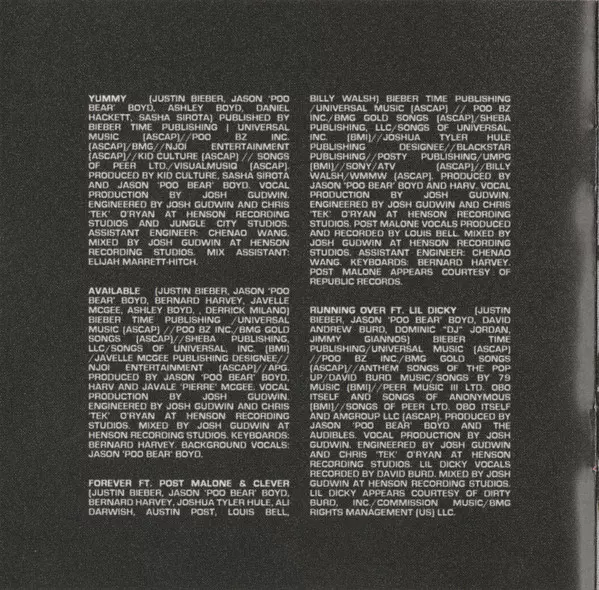 Keyboards Daniel Hackett | Producer Jason Boyd, Kid Culture (2) | Producer [Vocal Production] Josh Gudwin | Written-By Benjamin Bush, Daniel Daley, Daniel Hackett, Jason Boyd, Justin Bieber, Majid Al Maskati, Maneesh Bidaye, Paul Jefferies, Stephen Garrett, Timothy Mosley