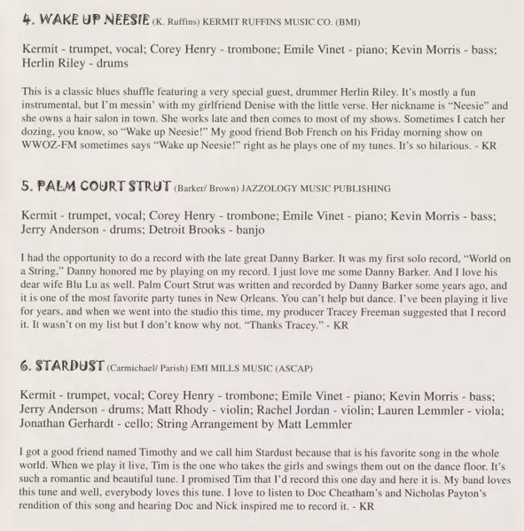 Backing Vocals Alfred Weston (2) | Bass Kevin Morris (7) | Drums Herlin Riley | Piano Emile Vinette | Tenor Saxophone Eric Traub | Trombone, Backing Vocals Corey Henry | Written-By Kermit Ruffins
