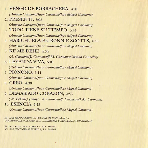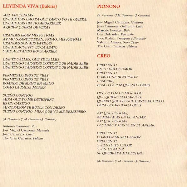 Double Bass [Contrabajo] Victor Merlo | Drums [Batería] Sergio Castillo | Guitar [Guitarra] Juan Carmona Amaya | Guitar [Guitarra], Mandola José Miguel Carmona | Soprano Saxophone Jorge Pardo | Trumpet, Flugelhorn [Fiscornio] Paco Ibáñez | Vocals [Voz] Antonio Carmona | Written-By Antonio Carmona, José Miguel Carmona, Juan Carmona Amaya