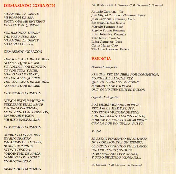 Bass [Bajo], Mandola Carles Benavent | Guitar [Guitarra], Backing Vocals [Coros] José Miguel Carmona, Juan Carmona Amaya | Handclaps [Palmas] The Gran Canarias | Soprano Saxophone Jorge Pardo | Vocals [Voz], Percussion [Percusión] Antonio Carmona | Written-By Antonio Carmona, José Miguel Carmona, Juan Carmona Amaya