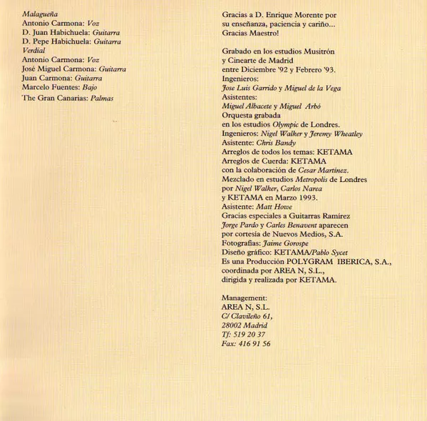 Double Bass [Contrabajo] Victor Merlo | Guitar [Guitarra] José Miguel Carmona | Guitar [Guitarra], Laúd Juan Carmona Amaya | Strings [Cuerdas] Orquesta de Gavin Wright | Vocals [Voz] Antonio Carmona | Written-By Antonio Carmona, José Miguel Carmona, Juan Carmona Amaya