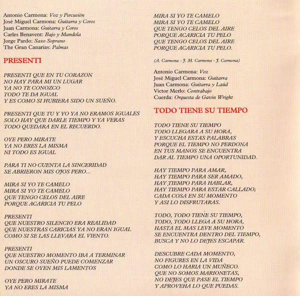 Baritone Saxophone Valentín Alvarez | Double Bass [Contrabajo Eléctrico] Charlie Prado | Guitar [Guitarra], Backing Vocals [Coros] José Miguel Carmona, Juan Carmona Amaya | Handclaps [Palmas] The Gran Canarias | Percussion [Percusión] Luis Dulzaides | Tenor Saxophone Ramón Cárdenas | Timbales [Timbal] Bondo | Trombone [Trombón] Antonio Pallarés | Trumpet Antonio Ramos (2), Paco Ibáñez | Vocals [Voz] Antonio Carmona | Written-By Antonio Carmona, Cristina González, José Miguel Carmona, Juan Carmona Amaya