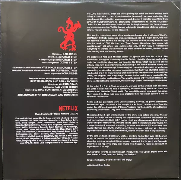"Stranger Things - Volume One" je sugestivní a strašidelný soundtrack k první sérii populárního originálního seriálu společnosti Netflix "Stranger Things", který vyšel v roce 2016. Album, jehož autory jsou Kyle Dixon a Michael Stein, kteří jsou součástí elektronické skupiny S U R V I V E, zachycuje nostalgickou a strašidelnou atmosféru, která seriál definuje. Soundtrack obsahuje směs syntezátorových skladeb, které jsou poctou filmové hudbě 80. let, zejména hororovým a sci-fi žánrům. Mezi pozoruhodné skladby na tomto albu patří "Run Away", "Kids" a "Eleven", které svými náladovými a atmosférickými tóny podtrhují klíčové momenty seriálu. Další skladby jako "Lights Out", "A Kiss" a "Stranger Things" se staly synonymem pro napínavou a tajemnou atmosféru seriálu. Na albu najdete také skladby "Nancy And Barb", "This Isn't You", "Lay-Z-Boy", "Friendship", "Castle Byers", "Hawkins", "The Upside Down", "After Sarah" a "One Blink For Yes". Každá skladba přispívá k celkové mrazivé zvukové krajině, kterou si fanoušci spojují s podivnými událostmi ve fiktivním městě Hawkins v Indianě.