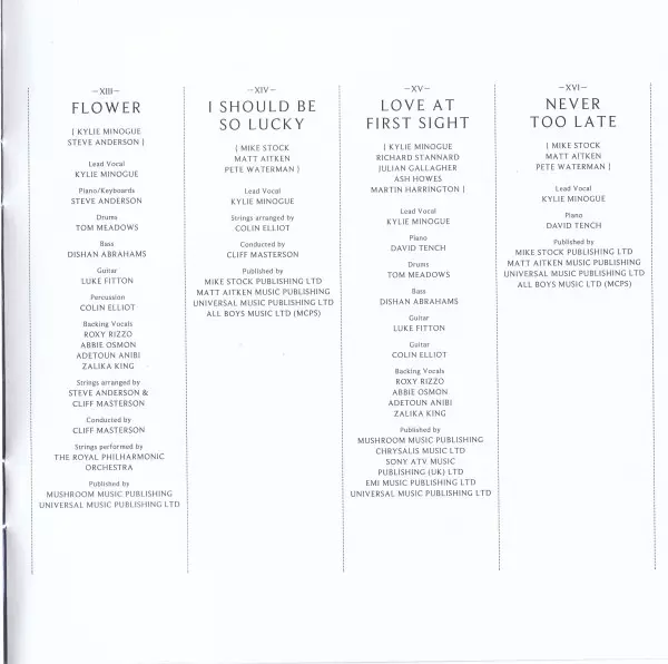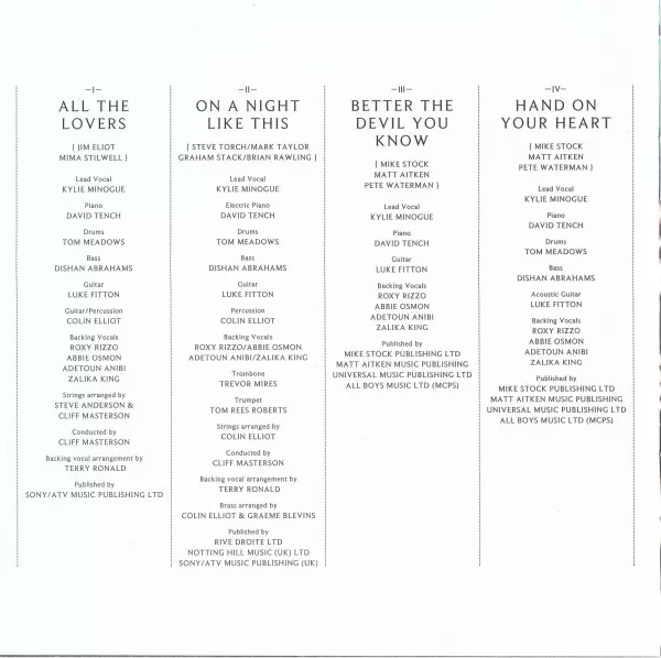 Arranged By [Strings] Cliff Masterson, Steve Anderson | Backing Vocals Abbie Osmon, Adetoun Anibi, Roxanne Wilde, Zalika King | Bass Dishan Abrahams | Conductor Cliff Masterson | Drums Tom Meadows | Guitar Luke Fitton | Lead Vocals Kylie Minogue | Percussion Colin Elliot, Tom Meadows | Piano David Tench | Written-By Stock, Aitken & Waterman