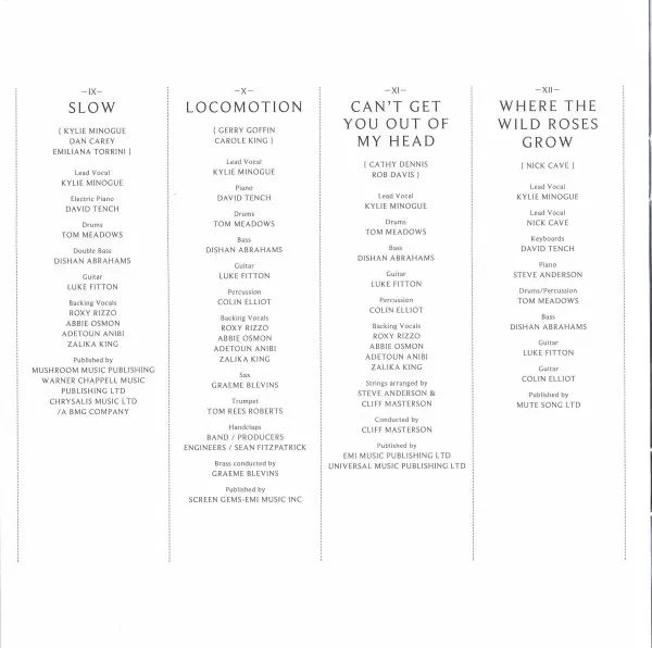 Arranged By [Strings] Cliff Masterson, Steve Anderson | Backing Vocals Abbie Osmon, Adetoun Anibi, Roxanne Wilde, Zalika King | Bass Dishan Abrahams | Conductor Cliff Masterson | Drums Tom Meadows | Guitar Luke Fitton | Lead Vocals Kylie Minogue | Percussion Colin Elliot | Written-By Cathy Dennis, Rob Davis