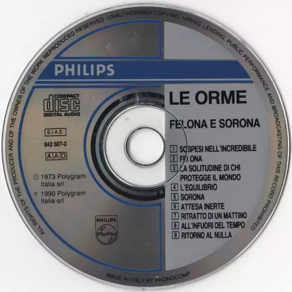 Le Orme: Felona E Sorona verze na CD v standardní edici. Toto konkrétní vydání vyšlo v Itálii ve vydavatelství Philips dne 20. října 1998. Album zasahuje do žánrů Rock a Progresivní rock.