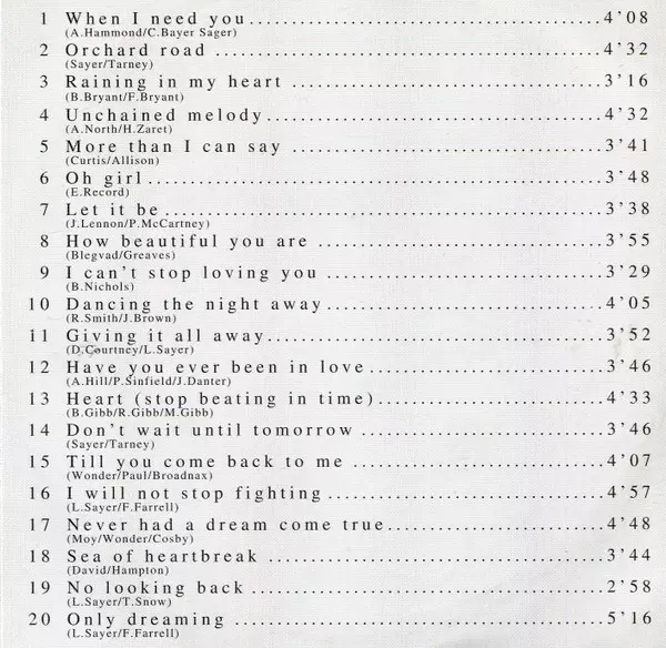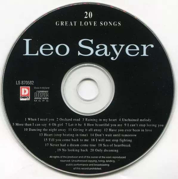 Leo Sayer: 20 Great Love Songs verze na CD v standardní edici. Toto konkrétní vydání vyšlo v Evropě ve vydavatelství Disky roku 1996. Album zasahuje do žánrů Pop, Balada, Pop Rock a Disco.