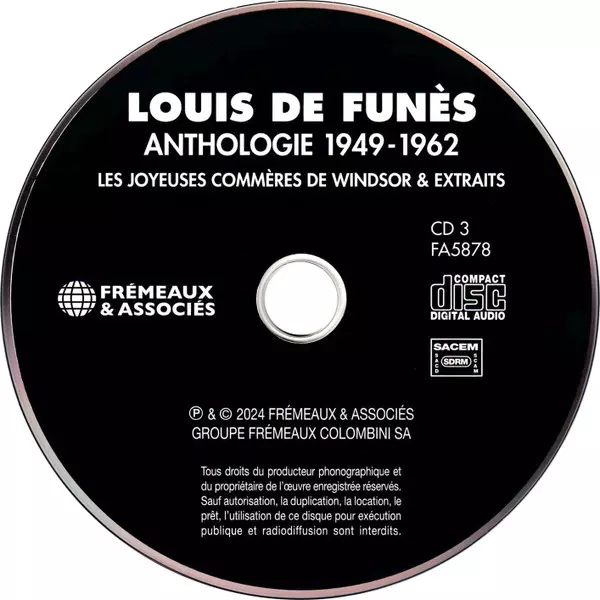 Louis De Funès: Anthologie 1949-1962 verze na 3CD v standardní edici. Toto konkrétní vydání vyšlo v Francii ve vydavatelství Frémeaux & Associés dne 7. února 2025. Album zasahuje do žánrů Stage & Screen, Non-Music, Radioplay, Komedie, Cabaret a Vaudeville.
