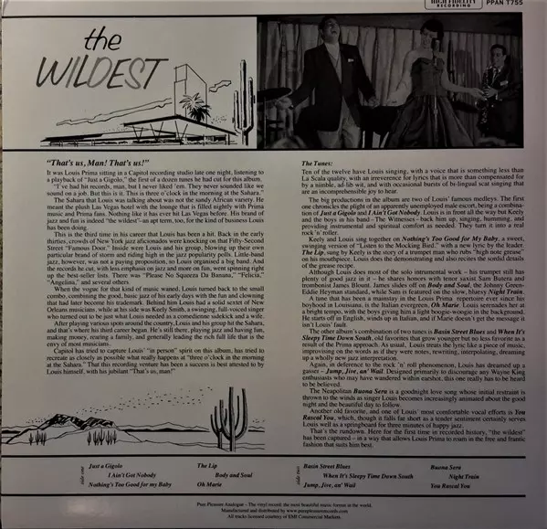 Primův význam pro popkulturu je značný, jeho ostentativně dávaný na odiv původ usnadnil ostatním italsko-americkým zpěvákům přihlásit se ke svým kořenům, byl prvním špičkovým interpretem, který byl pravidelně k vidění v salonech a kasinech v Las Vegas a pomohl rozšířit proměnu města v hlavní město zábavy. Jeho hudební odkaz se ukázal jako dlouhodobý, reinterpretace jeho klasických skladeb se staly současnými hity Davida Lee Rotha a Briana Setzera. V roce 1956 podepsal Prima novou smlouvu s Capitol Records, čímž začalo nejslavnější a nejvlivnější období jeho nahrávací kariéry. Jeho prvním albem pro tuto značku bylo v roce 1956 "The Wildest!", které úspěšně transformovalo jedinečnou atmosféru živých vystoupení do studiové nahrávky. Obsahuje mnoho jeho pozdějších a nejznámějších hitů, včetně medley "Just A Gigolo / I Ain't Got Nobody", "Jump, Jive an' Wail", "Buona Sera", "Oh Marie" a lehkého saunového duetu "The Lip". Album "The Greatest Hits" je vlastně "Greatest Hits", "The Wildest!" je klenotem v katalogu Louise Primy, žádná jiná skladba nemůže překonat tuto "zběsilou" směs bláznivě kymácejícího se, řvoucího saxofonu a výbušného swingu, tak rockovou jako nic jiného z té doby. Tato reedice měla být vydána již dávno.
