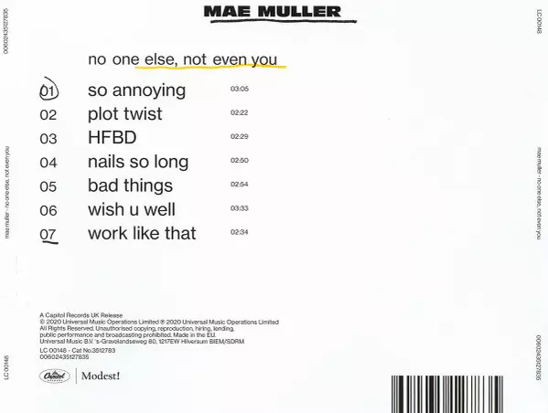 Mae Muller: No One Else, Not Even You verze na CD v standardní edici. Toto konkrétní vydání vyšlo v Velké Británii ve vydavatelství Capitol Records UK ve spolupráci s Modest! dne 27. listopadu 2020. Album lze řadit do žánru Pop.