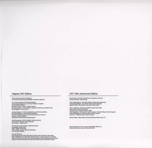 Arranged By [Strings] Katsuhisa Hattori | Backing Vocals Etsuko Yamakawa | Concertmaster [Strings] Masatsugu Shinozaki | Drums, Electric Guitar, Acoustic Guitar, Keyboards, Synthesizer, Sitar [Electric], Vibraphone [Vibe], Glockenspiel [Glocken], Percussion Tatsuro Yamashita | Electric Bass Koki Ito
