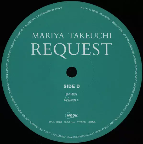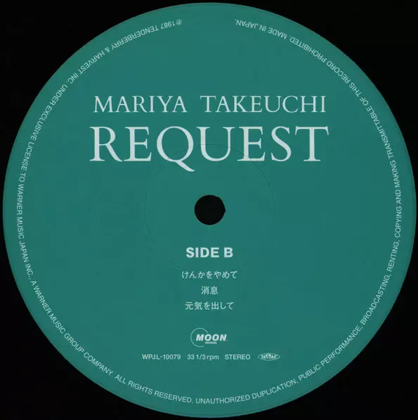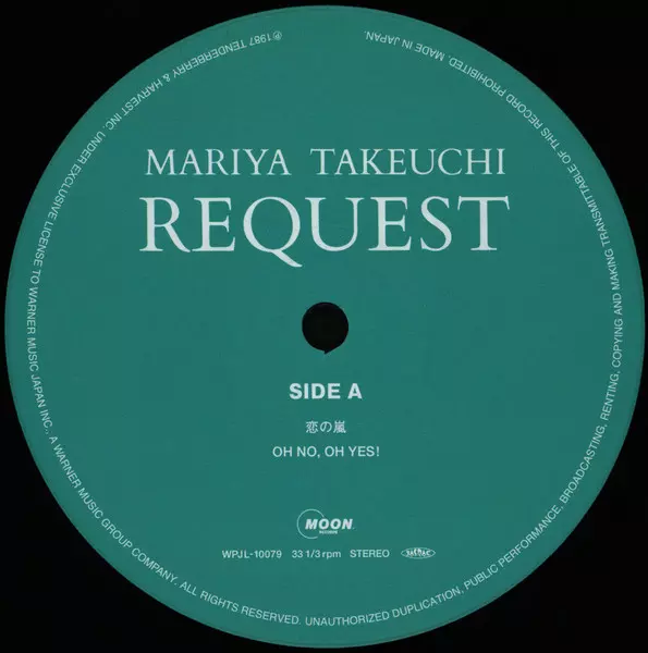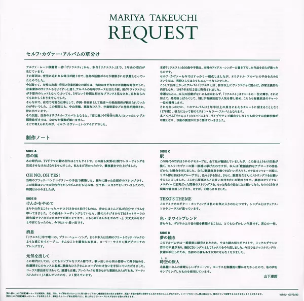 Mariya Takeuchi: Request = リクエスト (30th Anniversary Edition) LTD verze na vinylu 2LP v remasterované limitované edici. Toto konkrétní vydání vyšlo v Japonsku ve vydavatelství Moon Records (5) dne 21. března 2018. Album zasahuje do žánrů Pop, Elektronická hudba, Funk / Soul, Synth-pop, Funk, Kayōkyoku, Boogie a City Pop.