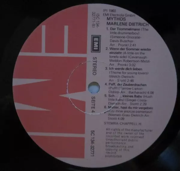Marlene Dietrich: Mythos Marlene Dietrich verze na vinylu 2LP v standardní edici. Toto konkrétní vydání vyšlo v Nizozemsku ve vydavatelství EMI ve spolupráci s EMI Electrola. Album zasahuje do žánrů Pop, Jazz, Vokál, Šlágr a Chanson. Gatefold Vinyl.