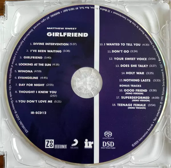 Matthew Sweet: Girlfriend verze na SACD v remasterované edici. Toto konkrétní vydání vyšlo v USA ve vydavatelství Intervention Records ve spolupráci s Zoo Entertainment a Sony Music Commercial Music Group dne 11. prosince 2020. Album zasahuje do žánrů Rock, Indie Rock a Pop Rock. SACD.