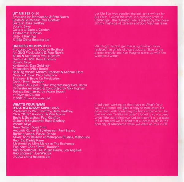 Acoustic Guitar, Synthesizer Paul Stacey | Backing Vocals Pascal Danaë | Bass Guitar Scott Firth | Beats, Scratches Paul Godfrey | Engineer Chris Harrison | Engineer [Rap] Joe Warlick | Featuring, Rap Big Daddy Kane | Guitar, Keyboards Ross Godfrey | Mastered By Mike Marsh | Mixed By Andy Baldwin | Producer Chris Harrison, Paul Godfrey, Pete Norris, Ross Godfrey | Vocals Skye (6)