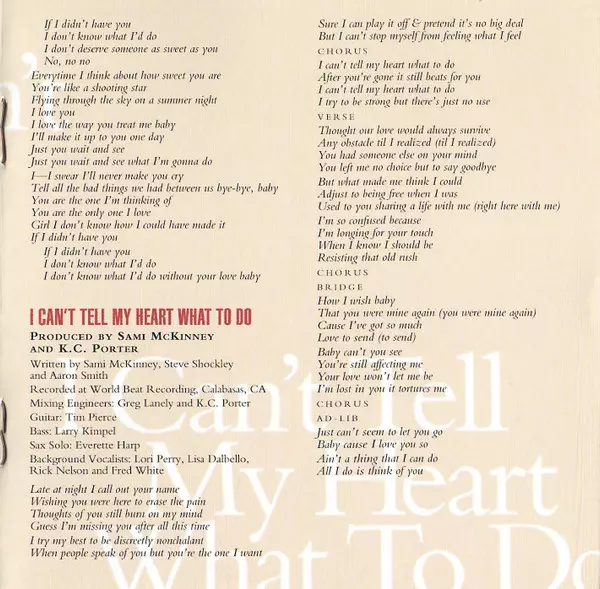 Backing Vocals Fred White (2), Lisa Dal Bello, Lori Perry, Rick Nelson | Bass Larry Kimpel | Guitar Tim Pierce | Saxophone Everette Harp | Written-By Aaron Smith (2), Sami McKinney, Stephen Shockley