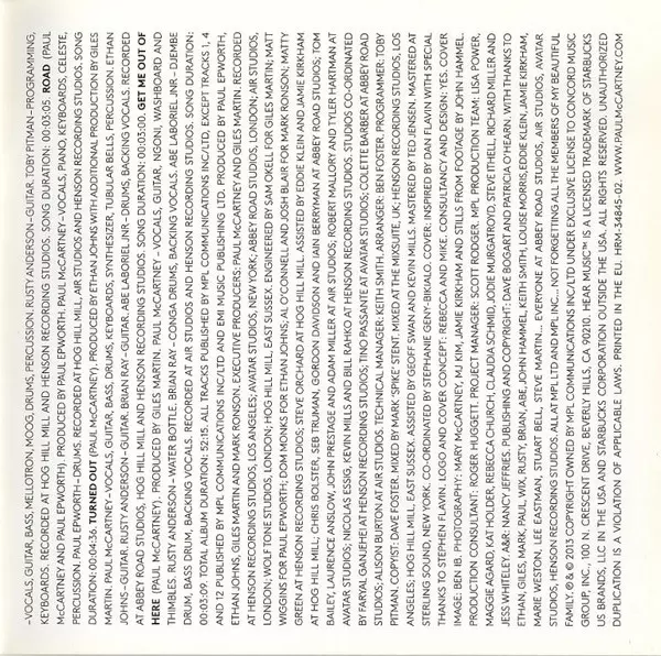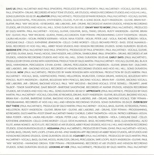 Alto Flute Anna Noakes, Eliza Marshall | Bass Richard Pryce, Steve McManus (2) | Cello Caroline Dale, Chris Worsey, Katherine Jenkinson | Drums Abraham Laboriel Jr. | Guitar Brian Ray, Rusty Anderson | Producer Giles Martin | Programmed By Toby Pitman | Viola Peter Lale, Rachel Robson | Violin Cathy Thompson, Laura Melhuish, Nina Foster, Patrick Kiernan | Written-By, Vocals, Bass, Guitar, Keyboards, Piano, Mellotron Paul McCartney