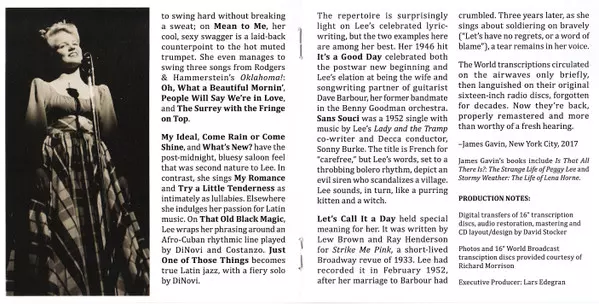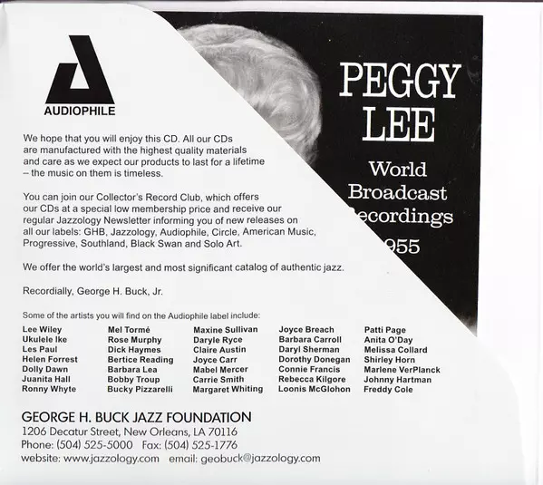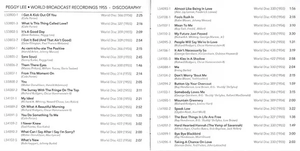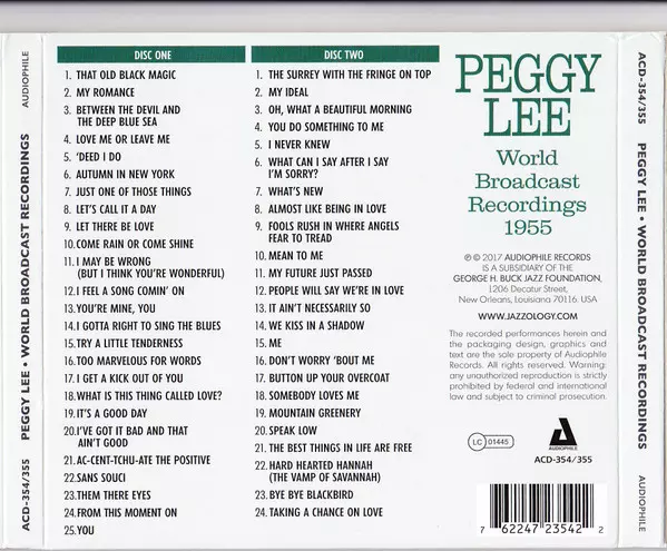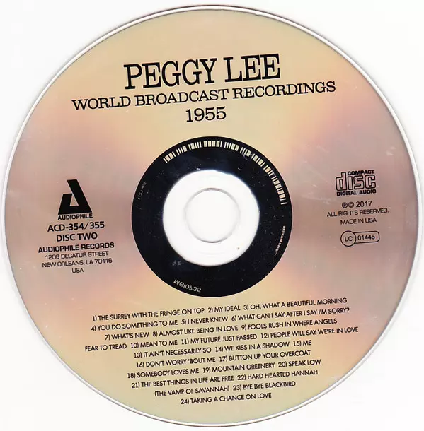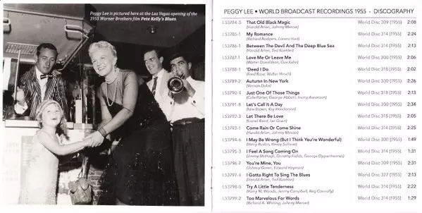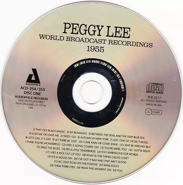 Peggy Lee: World Broadcast Recordings 1955 verze na 2CD v remasterované edici. Toto konkrétní vydání vyšlo ve vydavatelství Audiophile (2) dne 2. listopadu 2017. Album zasahuje do žánrů Pop, Jazz a Vokál.