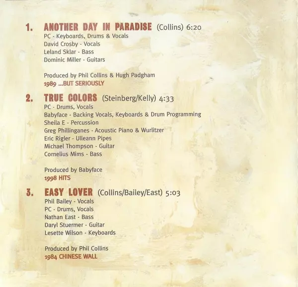 Arranged By [Horns] Harry Kim, Phil Collins | Bass Nathan East | Drums, Vocals Phil Collins | Horns Vine Street Horns | Keyboards Brad Cole | Lead Guitar Daryl Stuermer | Producer Hugh Padgham, Phil Collins | Rhythm Guitar Ronnie Caryl | Saxophone Andrew Woolfolk | Trombone Arturo Velasco | Trumpet Dan Fornero, Harry Kim | Vocals Amy Keys, Arnold McCuller | Written-By Phil Collins