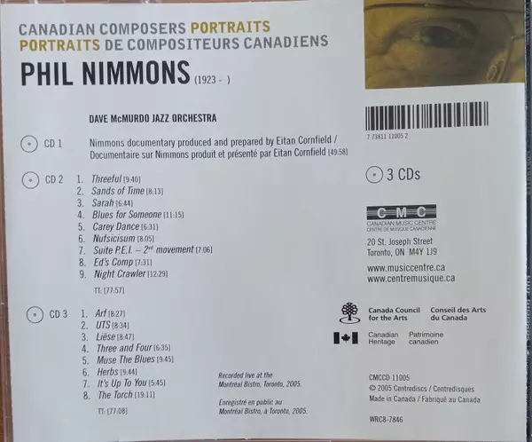 Phil Nimmons: Phil Nimmons verze na 3CD v standardní edici. Toto konkrétní vydání vyšlo v Kanadě ve vydavatelství Centrediscs dne 1. listopadu 2009. Album zasahuje do žánrů Jazz, Non-Music, Contemporary Jazz a Big Band.