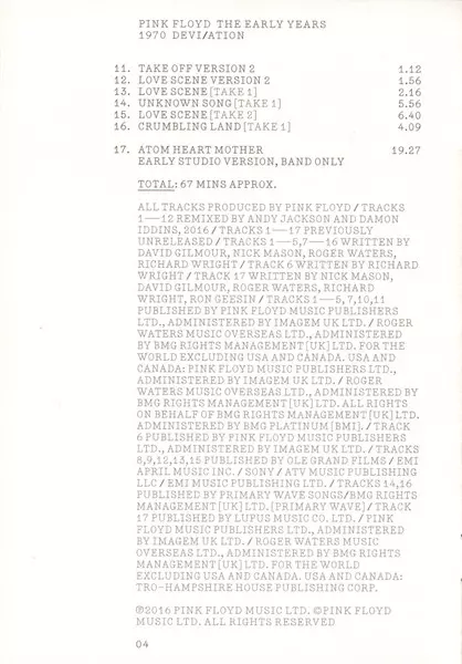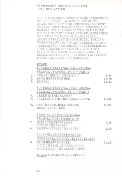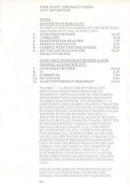 Pink Floyd: The Early Years 1970 Devi/ation verze na 2CD/2DVD/Blu-ray v standardní edici. Toto konkrétní vydání vyšlo v USA ve vydavatelství Pink Floyd Records dne 26. března 2017. Album lze řadit do žánru Rock. Region 0.