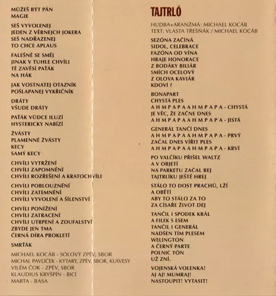 Bass Marta (41) | Drums Klaudius Kryšpín | Lyrics By Vlastimil Třešňák | Lyrics By, Vocals, Backing Vocals Michael Kocáb | Music By, Lyrics By, Arranged By, Guitar, Vocals, Backing Vocals, Keyboards Michal Pavlíček | Vocals Vilém Čok