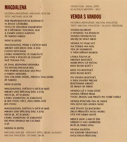 Bass Marta (41) | Drums Klaudius Kryšpín | Lyrics By Vlastimil Třešňák | Music By, Lyrics By, Arranged By, Guitar, Vocals, Backing Vocals, Keyboards Michal Pavlíček | Vocals, Backing Vocals Michael Kocáb, Vilém Čok