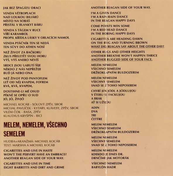 Bass Marta (41) | Drums Klaudius Kryšpín | Lyrics By Josef Novotný | Lyrics By, Guitar, Backing Vocals Michal Pavlíček | Lyrics By, Vocals, Backing Vocals Vilém Čok | Music By, Lyrics By, Arranged By, Vocals, Backing Vocals, Keyboards Michael Kocáb