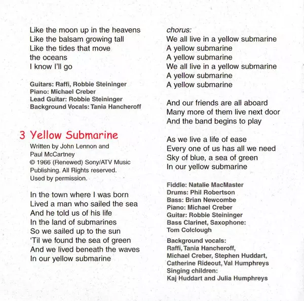 Backing Vocals [Background Vocals] Catherine Rideout, Michael Creber, Raffi (2), Stephen Huddart, Tania Hancheroff, Val Humphreys | Backing Vocals [Singing Children] Julia Humphreys, Kaj Huddart | Bass Brian Newcombe | Bass Clarinet, Saxophone Tom Colclough | Drums Phil Robertson (2) | Fiddle Natalie MacMaster | Guitar Robbie Steininger | Piano Michael Creber | Written-By Lennon-McCartney
