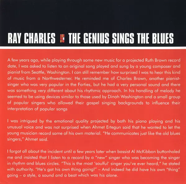 Tyto bluesové skvosty, včetně klasických skladeb jako "Early In The Mornin'", "I'm Movin' On" a "The Right Time", jsou zpívány se stejnou vášní, přesvědčivostí a energií, s jakou Ray Charles zpíval soul a country.