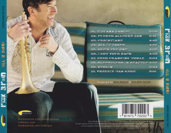 Rick Braun: All It Takes verze na CD v standardní edici. Toto konkrétní vydání vyšlo v USA ve vydavatelství Artistry Music dne 30. července 2009. Album zasahuje do žánrů Jazz a Contemporary Jazz.