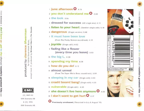 Roxette: Don't Bore Us - Get To The Chorus! (Roxette's Greatest Hits) verze na CD v standardní edici. Toto konkrétní vydání vyšlo v Francii ve vydavatelství EMI roku 1995. Album zasahuje do žánrů Rock, Pop a Pop Rock.