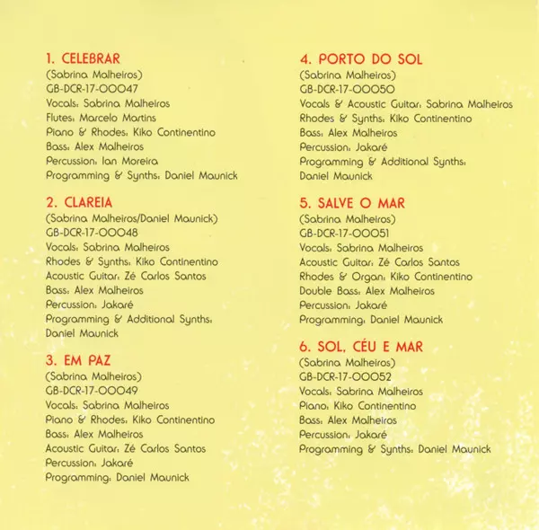 Acoustic Guitar Zé Carlos Santos | Bass Alex Malheiros | Flute [Flutes] Leo Gandelman | Percussion Jakaré Garcia | Piano Kiko Continentino | Programmed By [Programming] Daniel Maunick | Vocals Sabrina Malheiros | Written-By Sabrina Malheiros