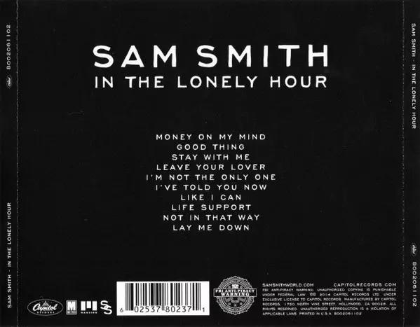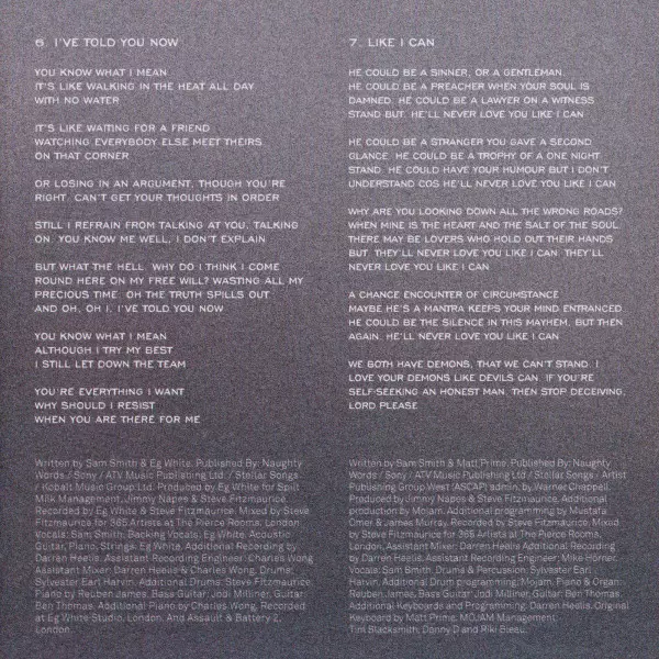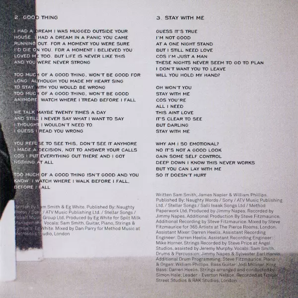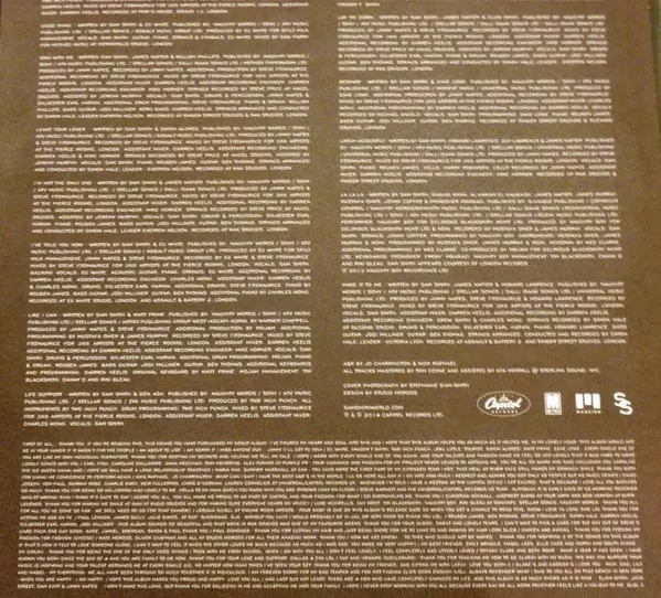 Arranged By [Strings], Conductor [Strings] Simon Hale | Drums, Percussion Earl Harvin | Engineer [Assistant Recording Engineer] Mike Horner | Guitar Ben Thomas (9) | Leader [Strings] Everton Nelson | Mixed By [Assistant], Recorded By [Additional] Darren Heelis | Piano Reuben James | Producer Jimmy Napes, Steve Fitzmaurice | Recorded By [Strings - Assistant] Jeremy Murphy | Recorded By [Strings] Steve Price (6) | Recorded By, Mixed By Steve Fitzmaurice | Vocals Sam Smith (12) | Written-By James Napier, Sam Smith (12)