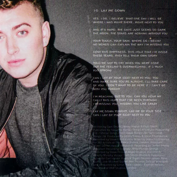 Arranged By [Strings], Conductor [Strings] Simon Hale | Engineer [Assistant Recording Engineer] Darren Heelis, Mike Horner | Guitar Ben Thomas (9) | Leader [Strings] Everton Nelson | Mixed By [Assistant] Darren Heelis | Piano Reuben James | Producer Jimmy Napes, Steve Fitzmaurice | Recorded By [Strings - Assistant] Jeremy Murphy | Recorded By [Strings] Steve Price (6) | Recorded By, Mixed By Steve Fitzmaurice | Vocals Sam Smith (12) | Written-By Sam Smith (12), Simon Aldred
