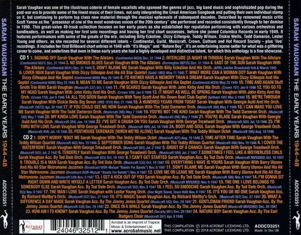 Sarah Vaughan: The Early Years 1944-48 verze na 2CD v standardní edici. Toto konkrétní vydání vyšlo v Velké Británii ve vydavatelství Acrobat dne 6. července 2018. Album zasahuje do žánrů Jazz a Vokál.