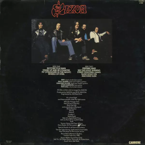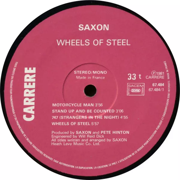 Saxon: Wheels Of Steel verze na vinylu LP v standardní edici. Toto konkrétní vydání vyšlo v Francii ve vydavatelství Carrere roku 1981.