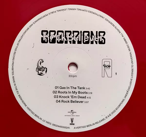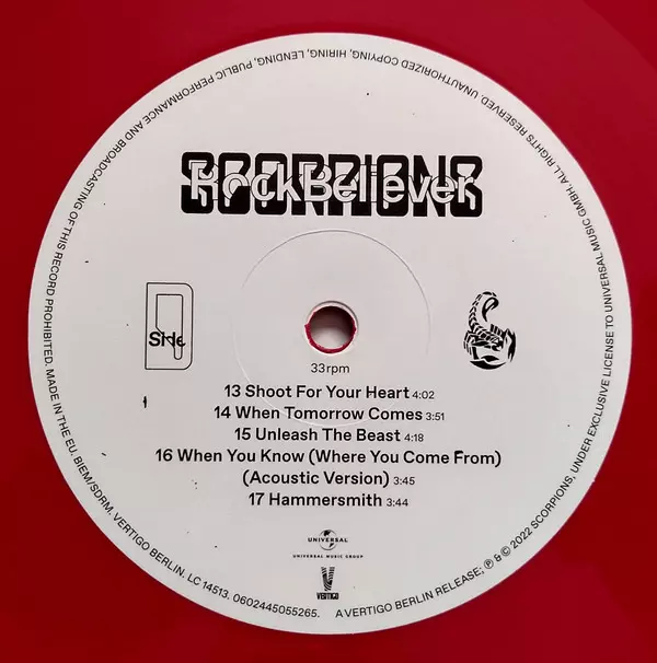 Scorpions: Rock Believer LTD verze na vinylu 2LP v limitované edici. Toto konkrétní vydání vyšlo v Velké Británii ve vydavatelství Vertigo Berlin dne 29. července 2022.
