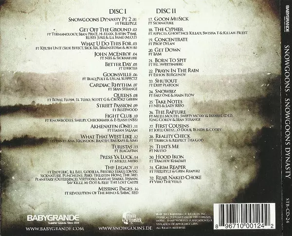 Snowgoons: Snowgoons Dynasty verze na 2CD v standardní edici. Toto konkrétní vydání vyšlo v USA ve vydavatelství Babygrande ve spolupráci s Goon MuSick a Switchblade Music dne 17. července 2012. Album lze řadit do žánru Hip Hop.