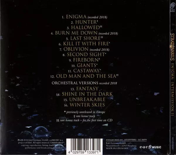 "ENIGMA: Intermission II" obsahuje tři zbrusu nové písně a poprvé v historii kapely také orchestrální úpravy čtyř pečlivě vybraných klasických skladeb "Stratovarius". Koncept alba je podobný jako u "Intermission", které vyšlo před 17 lety mezi dvěma klasickými alby "Infinite" a "Elements". Na více než osmdesáti minutách se powermetalový velikán ...