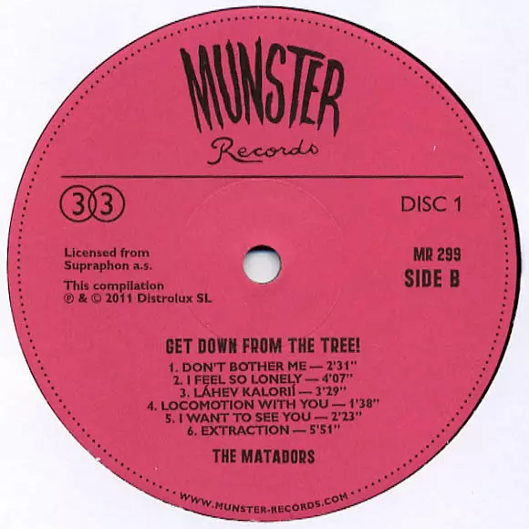 The Matadors: Get Down From The Tree! verze na vinylu 2LP v remasterované edici. Toto konkrétní vydání vyšlo v Španělsku ve vydavatelství Munster Records dne 1. března 2011. Album zasahuje do žánrů Rock, Beat, Rhythm & Blues, Psychedelický rock, Garage Rock, Rock & Roll a Československé klasiky.