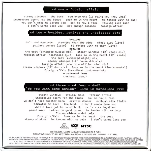 Tina Turner: Foreign Affair DLX verze na 4CD/DVD/Box Set v deluxe remasterované edici. Toto konkrétní vydání vyšlo v Evropě a USA ve vydavatelství Parlophone dne 16. července 2021.